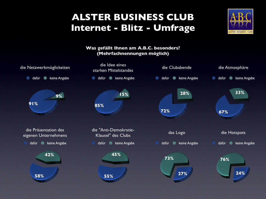 | "Was gefällt Ihnen am A.B.C. besonders?" lautete die erste Frage, die die Mitglieder mit Mehrfachnennungen beantworten konnten. 91% gefallen erwartungsgemäß die Netzwerkmöglichkeiten, 85% die Idee eines starken Mittelstandes, 72% die Themen der Clubabende und 67% die besonders integrierende Atmosphäre der Initiatoren. Stellvertr. Clubpräsident Leon van den Bergh: "Erstaunt hat uns, dass unseren Mitgliedern das zugegeben sehr professionelle Club - Logo mehr gefällt als unsere Arbeitskreise, die wir Hotspots nennen." Jens Kahlsdorf ergänzt: "Verblüffend finde ich auch, dass unsere Anti-Demokratie-Klausel 55% unserer Mitglieder ganz besonders gefällt. Dieses Ergebnis lässt auf eine |