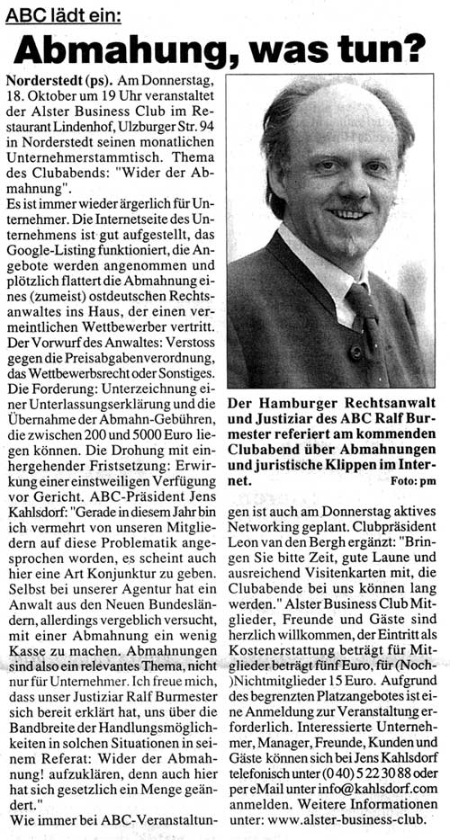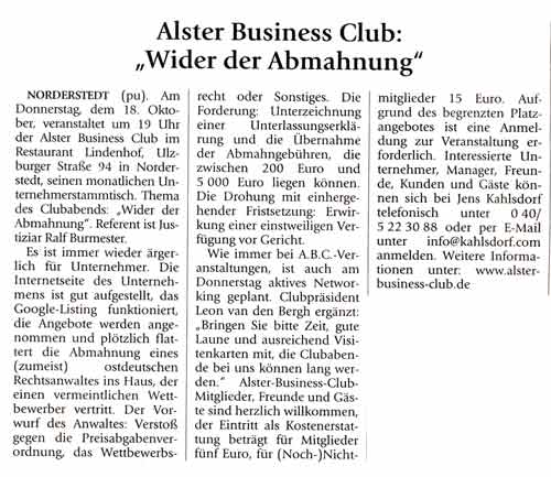 Metropolregion Hamburg. Am Donnerstag, 18.10.2007 um 19:00 Uhr veranstaltet der ALSTER BUSINESS CLUB im Restaurant Lindenhof, Ulzburger Str. 94 in Norderstedt seinen monatlichen Unternehmerstammtisch. Thema des Clubabends: "Wider der Abmahnung".