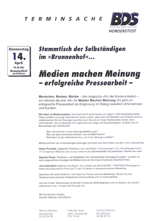 Medien machen Meinung: Fachvortrag von Jens Kahlsdorf, geschäftsführender Gesellschafter der KAHLSDORF + PARTNER Werbeagentur Hamburg zum Thema Pressearbeit |