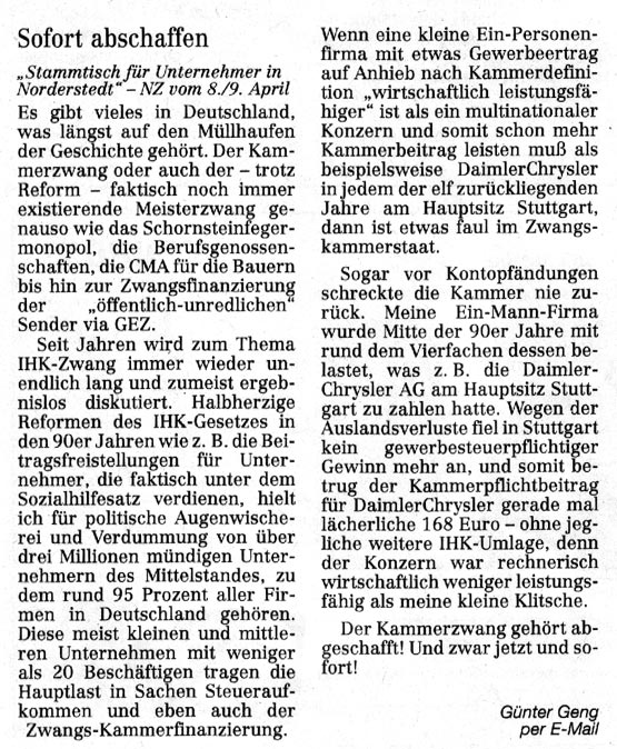 "Sofort abschaffen" erschienen in der Norderstedter Zeitung am 12. April 2006. |