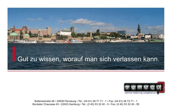 Die semeco GmbH ist im Bereich Zähler-, Daten- und Abrechnungsmanagent tätig. Die Tochter der Flensburger Stadtwerke beauftragt KAHLSDORF + PARTNER Werbeagentur Hamburg mit der Produktion eines Kalendermotives zur Herstellung von Drei-Monats-Kalendern. Gewünscht wird ein typisches Hamburger Bildmotiv. KAHLSDORF + PARTNER Werbeagentur organisiert kurzerhand ein Fotoshooting im Hamburger Hafen und fotografiert die St. Pauli Landungsbrücken, eines der Wahrzeichen und Touristenattraktionen Hamburgs. Das Foto wird anschließend grafisch aufbereitet, Layout und Design des Kalenderkopfes an das existierende corporate Design von semeco angepaßt. Ein Andruck des fertigen Kalendermotives dient zur Kontrolle und Freigabe durch den Kunden.