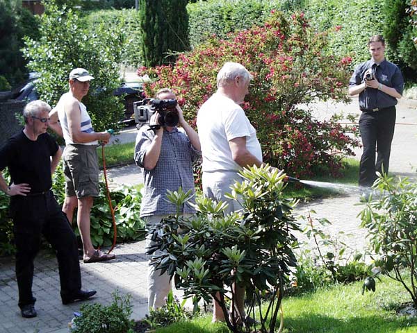 Aufgabe des Werbespots für die Stadtwerke Norderstedt war es, auf die Lieferung des Stadtwassers auf humorvolle Art hinzuweisen. Nach vorherigem Casting wurden zwei Laienschauspieler verpflichtet, die zwei Nachbarn darstellen sollten, die sich nicht sonderlich wohl gesonnen sind. Beim Wassersprengen des Vorgartens geschieht dann das Außergewöhnliche..... Aber schauen Sie sich den Stadtwerke Norderstedt Werbespot, der auf dem Norderstedter Fernsehsender noa 4 geschaltet wurde, einfach selbst an. Auf der vorangegangenen Site können Sie ihn als webstream downloaden. Hier sehen Sie Bilder vom Set. Der Film wurde im Frühjahr 2003 abgedreht. Um eine größere Ansicht der Fotos zu erhalten, klicken Sie bitte auf die kleinen Vorschau-Bilder.